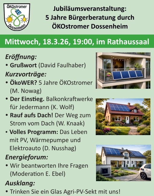 Save the Date: im Rathaussaal am Mi 18.03.2026 19:00h gibt es ein „Energieforum spezial“ anlässlich 5 Jahre Beratung und Information durch die ÖKOstromer Dossenheim.